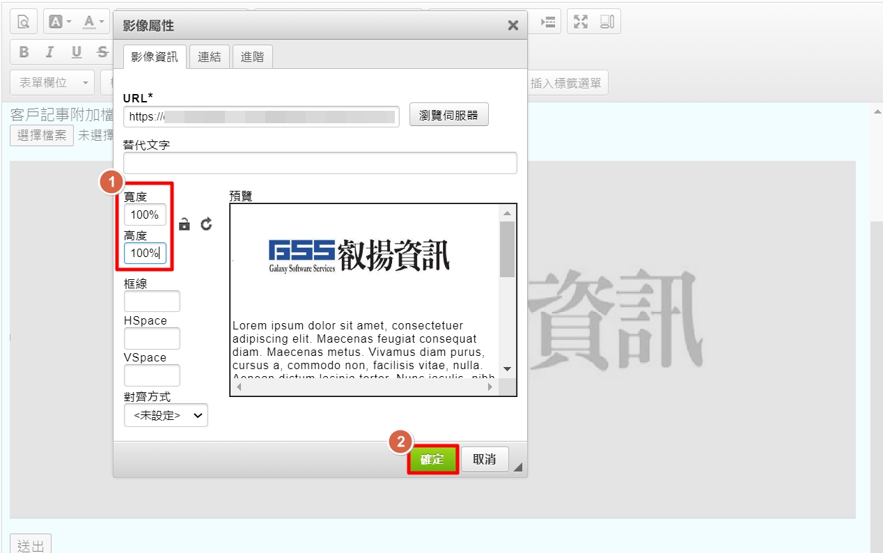 3.將寬、高欄位都改為100%,改完後按下右下角的確認鍵。