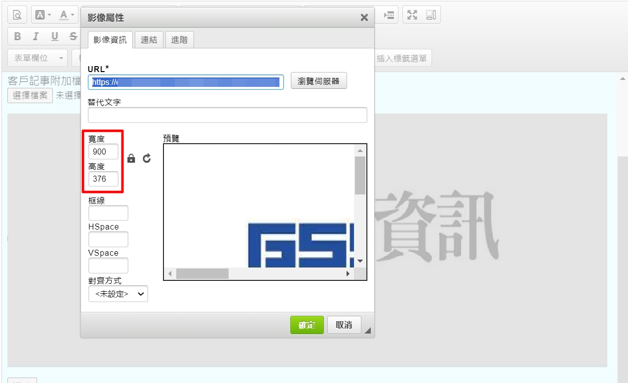 2.接著會出現影像屬性的小視窗,請編輯紅色框起來的部分。