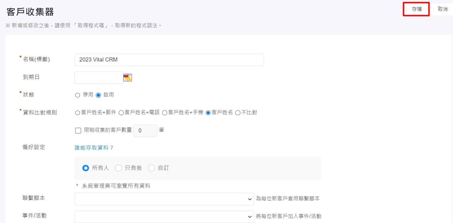 4.確認收集器內容都正確後,記得在右上方點選存檔。