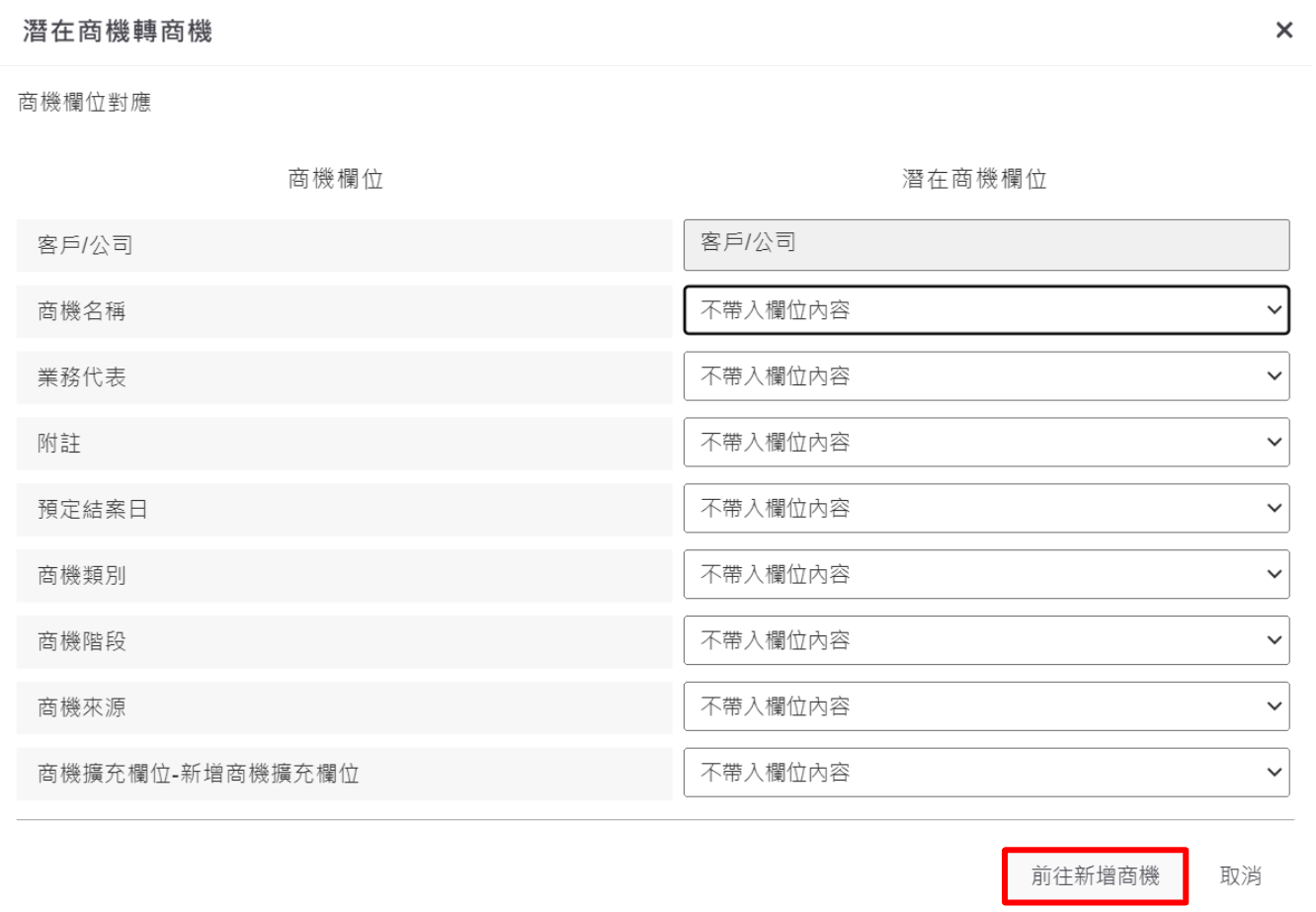 接著,會出現欄位對應的畫面,選擇好對應欄位後,點選下方【前往新增商機】即會跳至新增商機的頁面。
