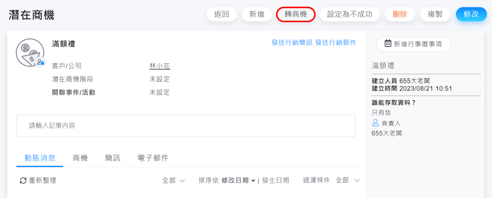 請至列表左上方【潛在商機】點選您欲轉商機的潛在商機,進入頁面後,點選右上角【轉商機】。