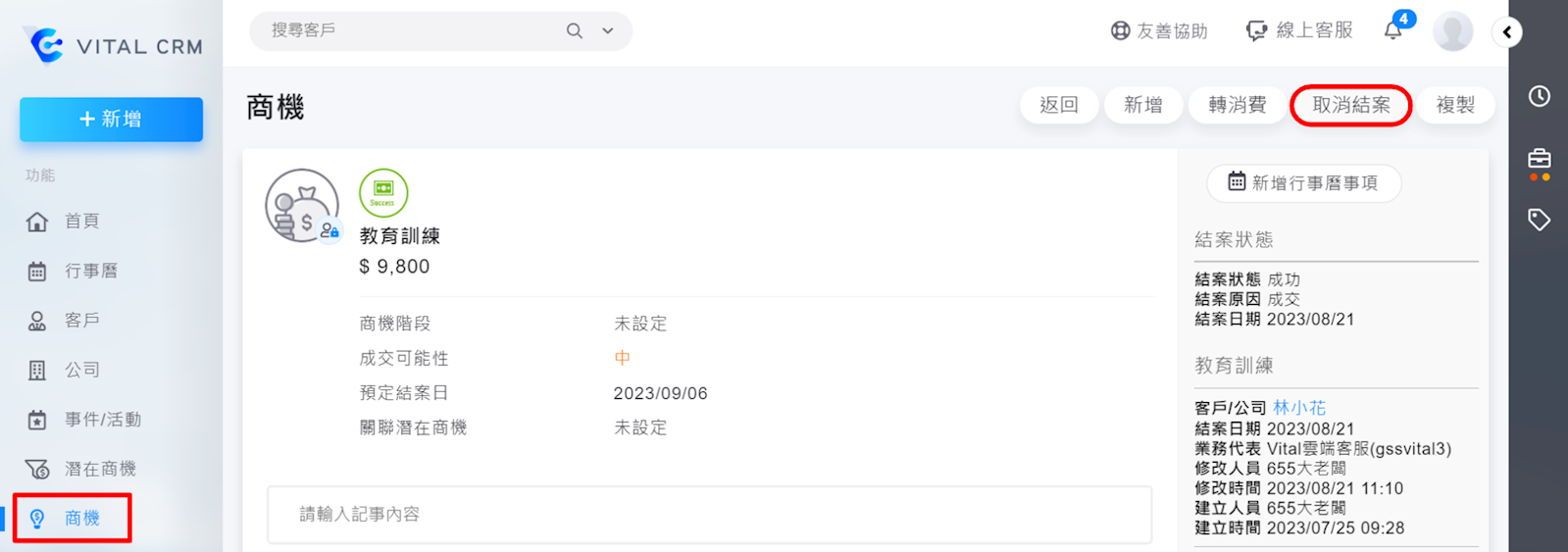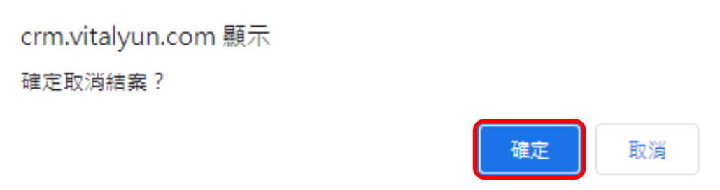 1. 請至列表左上方【商機】點選欲修改的商機,右上角的【取消結案】的按鈕。系統會跳出再次確認的視窗,請選擇下方確定。
