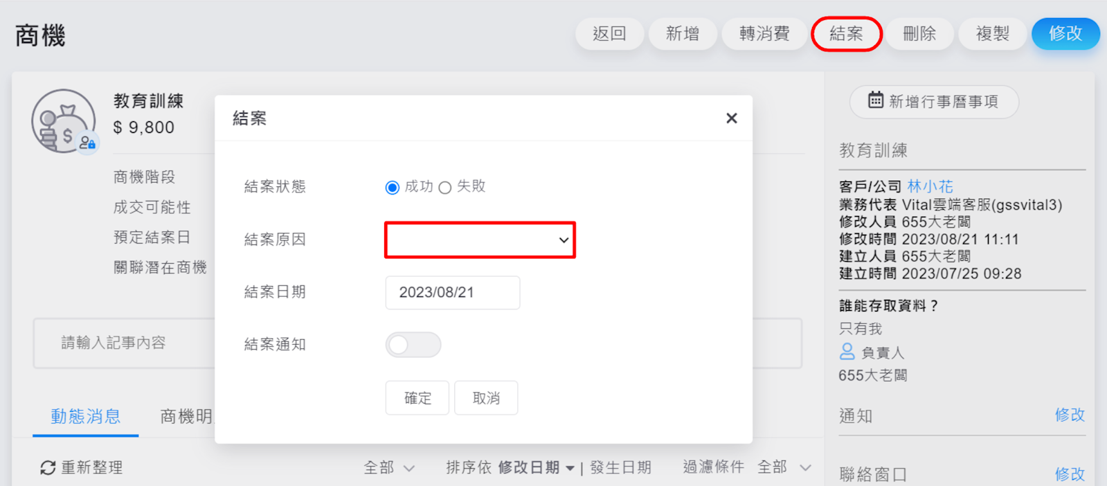 商機結案後,即無法再做更動,所以無法修改結案原因,若需要修改,請先取消結案後,再次結案。