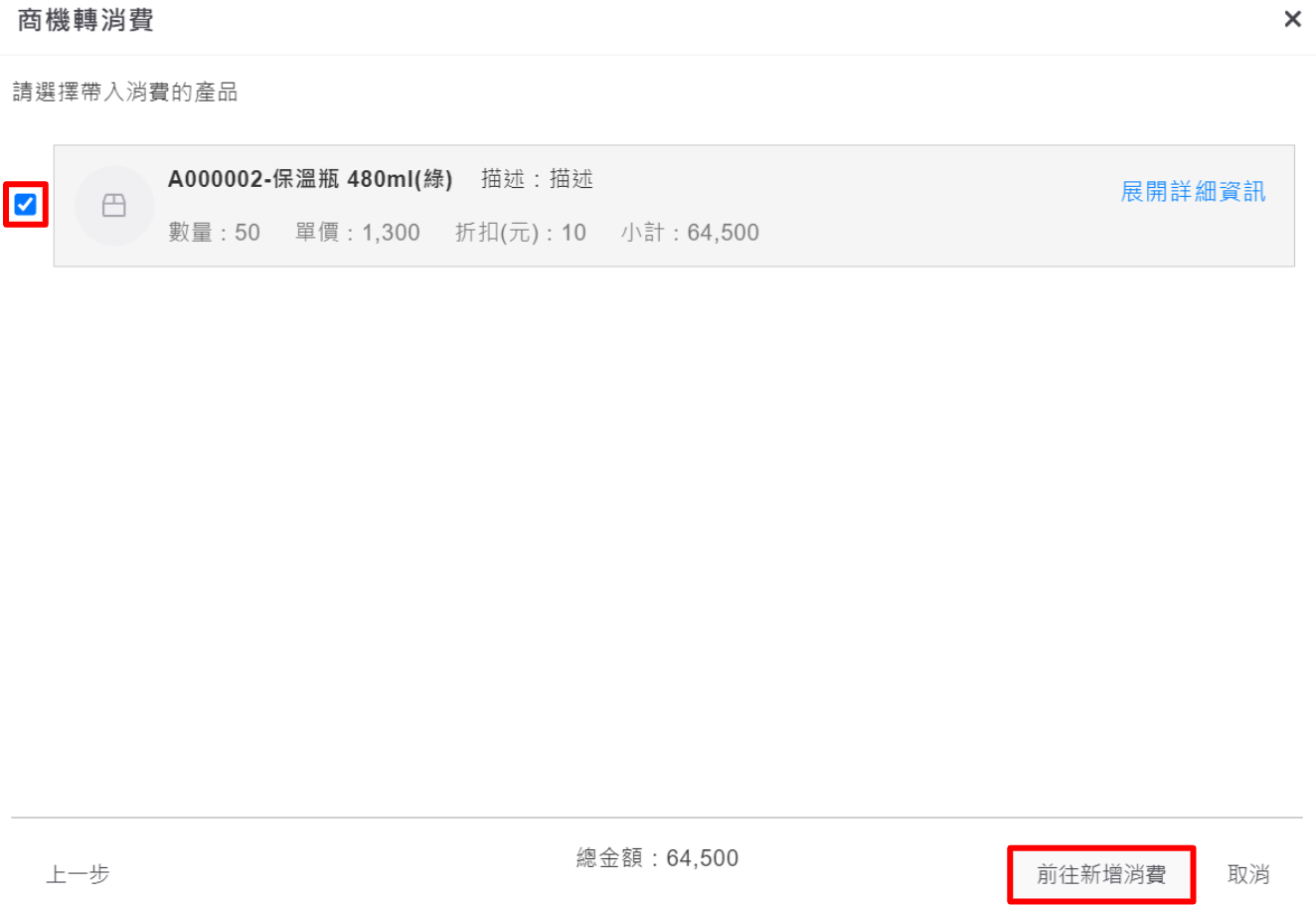 3. 勾選欲帶入消費的產品(商機明細),完成上述步驟後,點選【前往新增消費】: