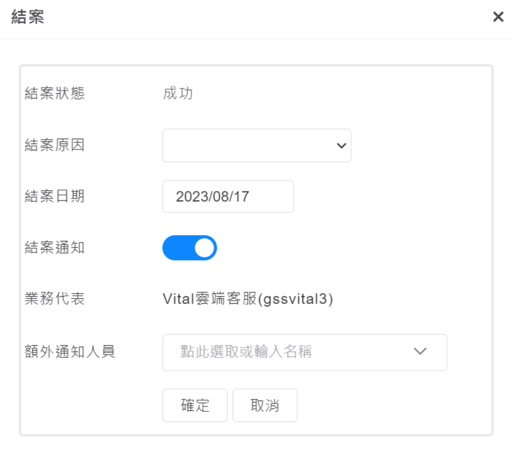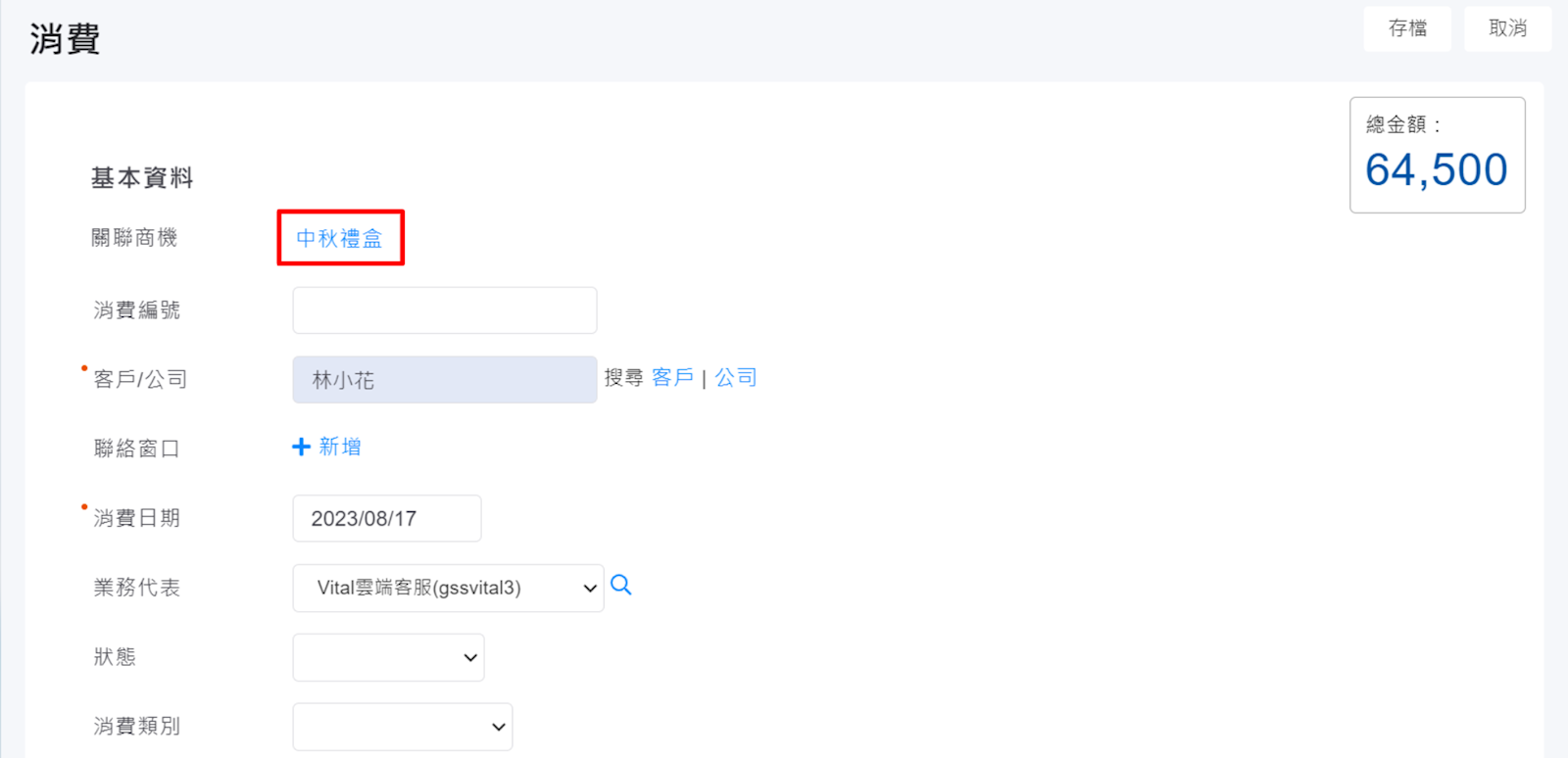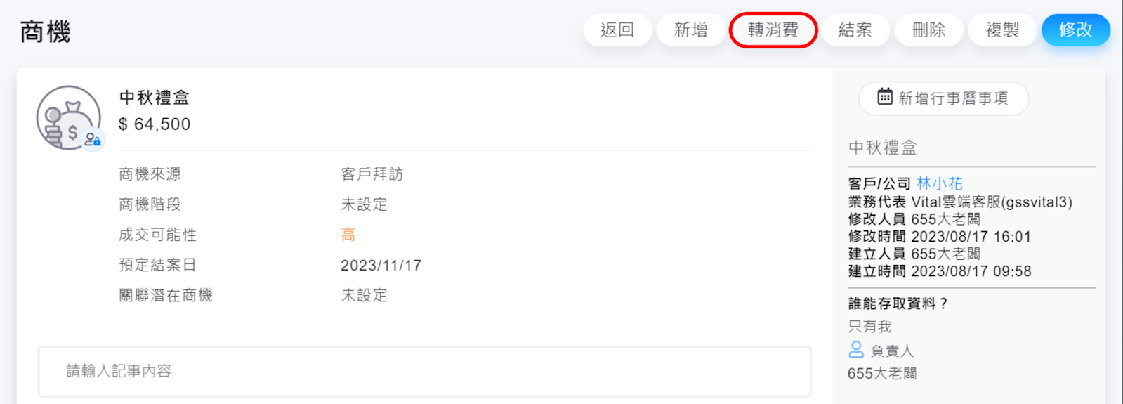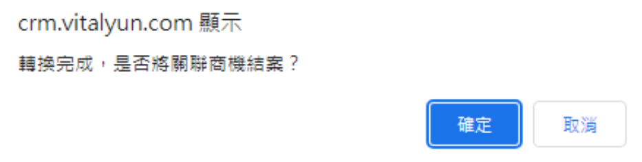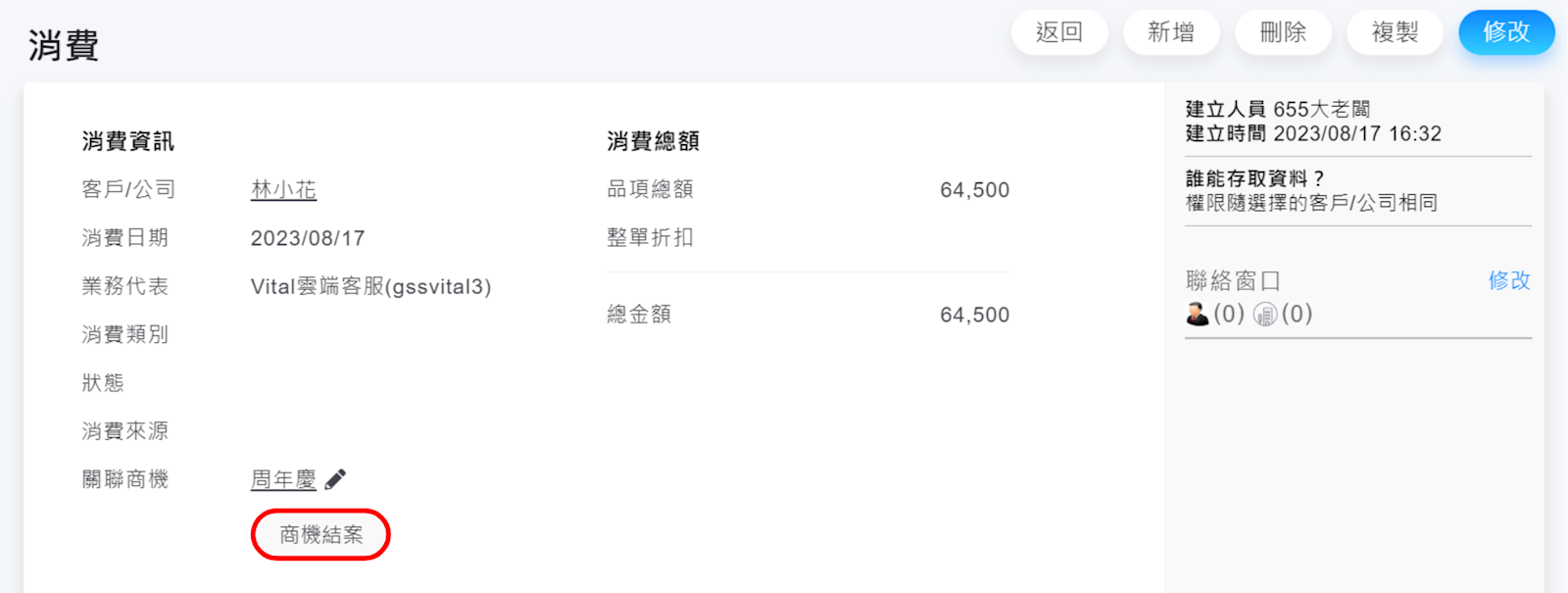 5. 存檔後前往消費詳細資料頁面,如具有該商機的結案權限(商機的負責人或系統管理員)且商機尚未結案,系統會提醒是否結案: