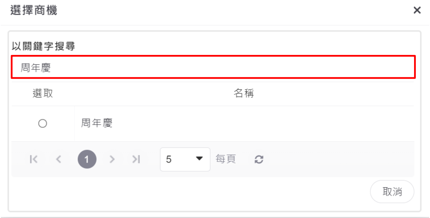 2. 點擊鉛筆圖示,可以選擇此消費的關聯商機,亦可以使用關鍵字搜尋: