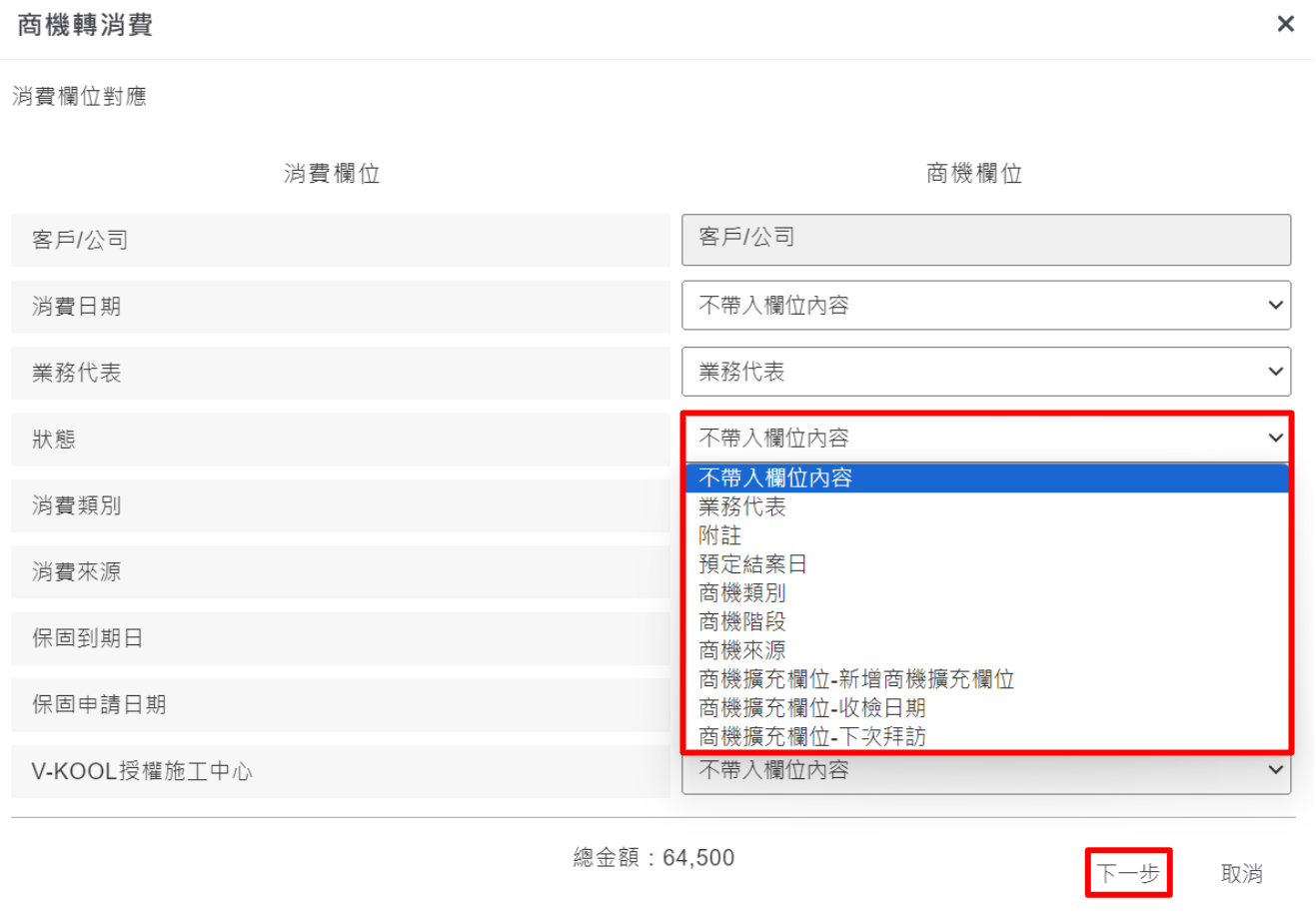 2. 點選後,首先進行欄位對應,將商機欄位帶入消費資料內(系統會記住前一次選擇對應的欄位,如需修改可重新選擇),選擇完畢後點選下方【下一步】: