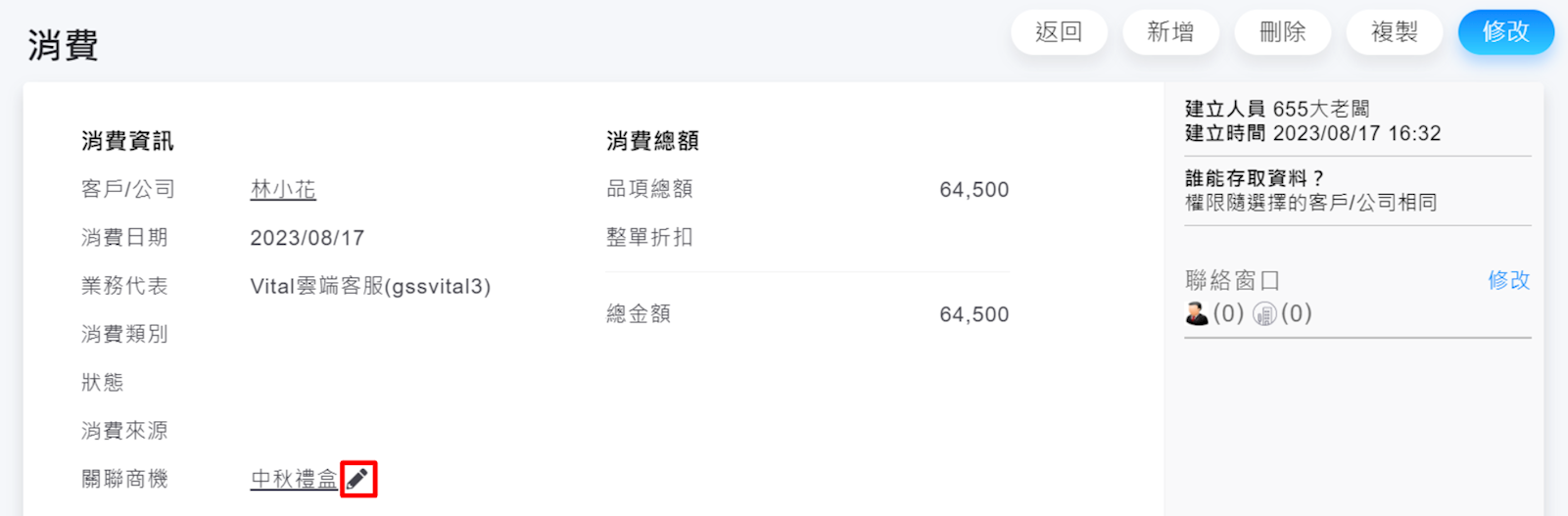 1. 於消費詳細資料畫面,可以將關聯商機結案;滑鼠經過關聯商機欄位時,會出現鉛筆圖示(須具有修改消費的權限):
