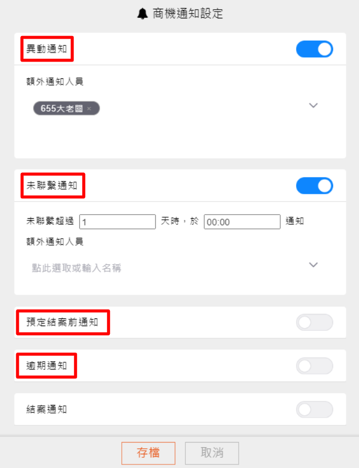 設定所有類型的商機通知預設開關與額外通知人。