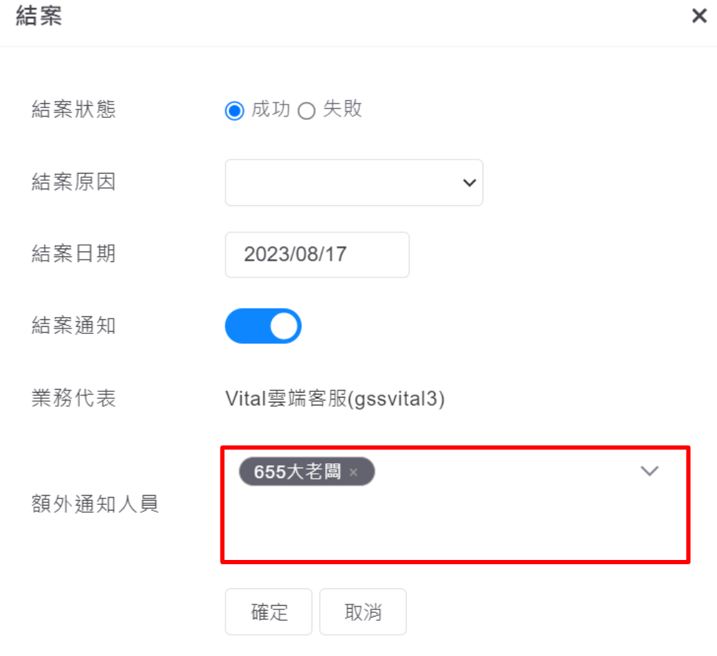 如有設定結案預設通知,當商機結案時,系統也會自動將預設通知人員帶入: