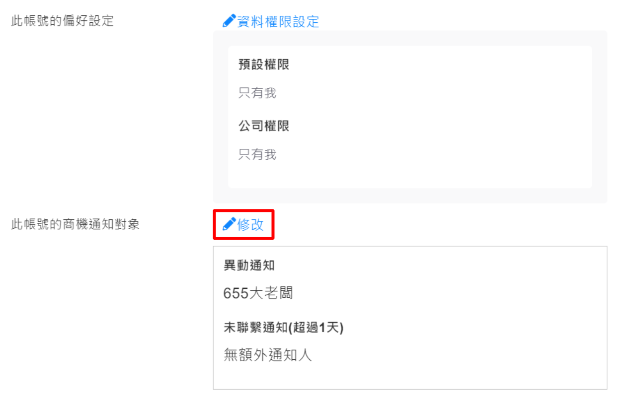 - 異動通知:商機基本資料被修改時,就會發送通知給指定帳號