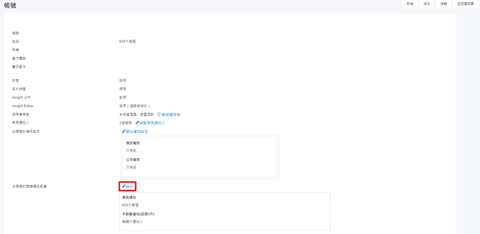 管理員也可以於【管理>帳號>帳號】的詳細資料畫面協助設定: