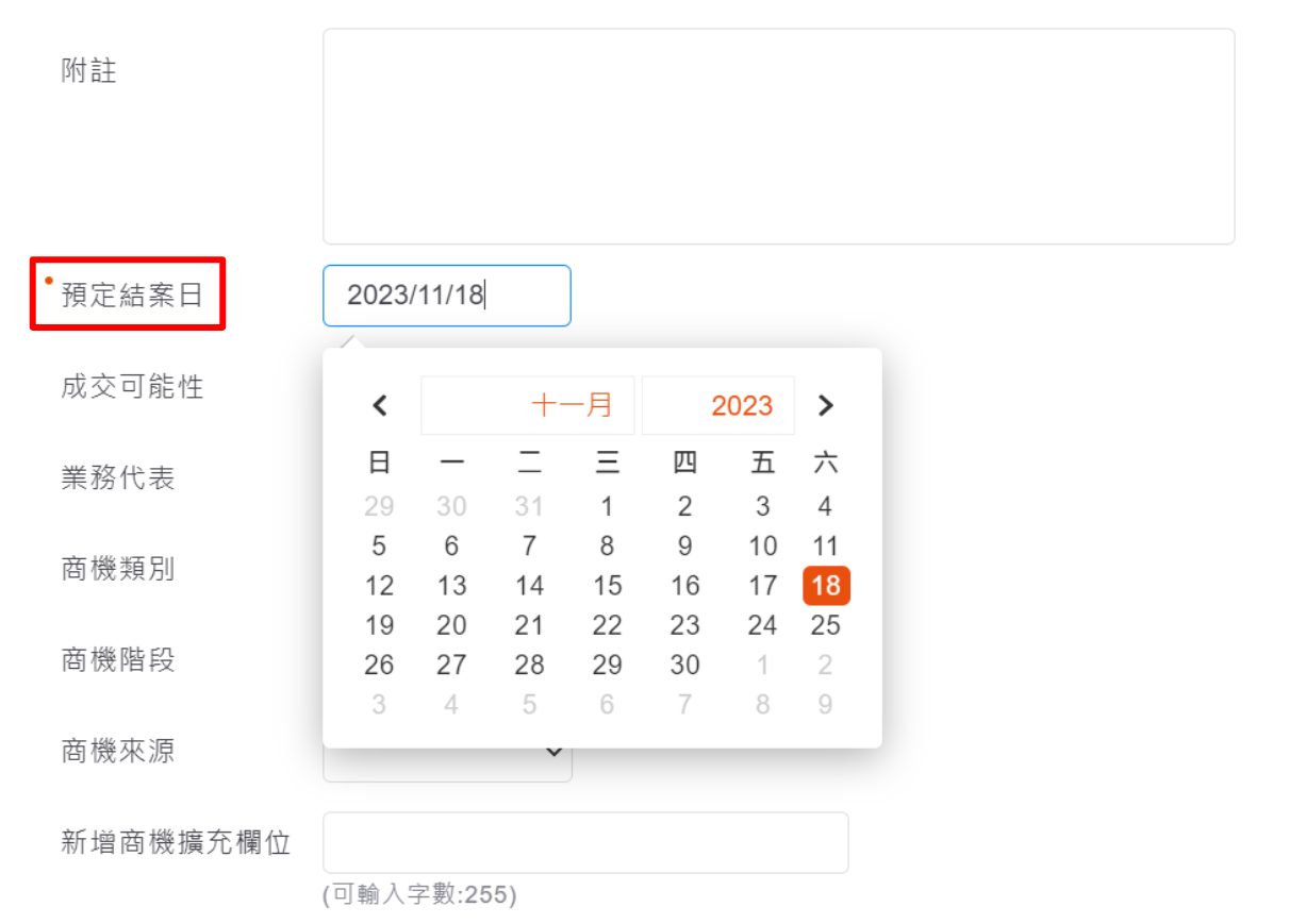 請至【商機>新增>預定結案日】,新增商機時,您可以自行選擇結案日期。
