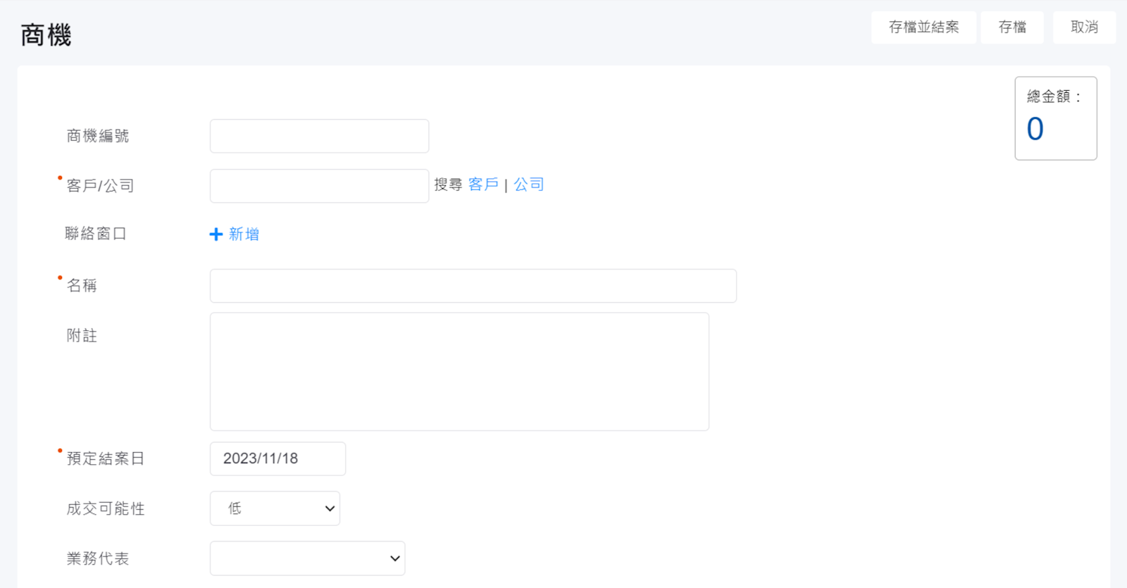 - 商機名稱:業務定義這個銷售案的案名,可以自行定義,方便自行管理辨別