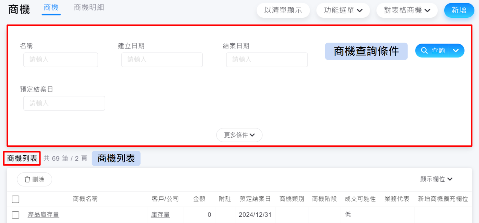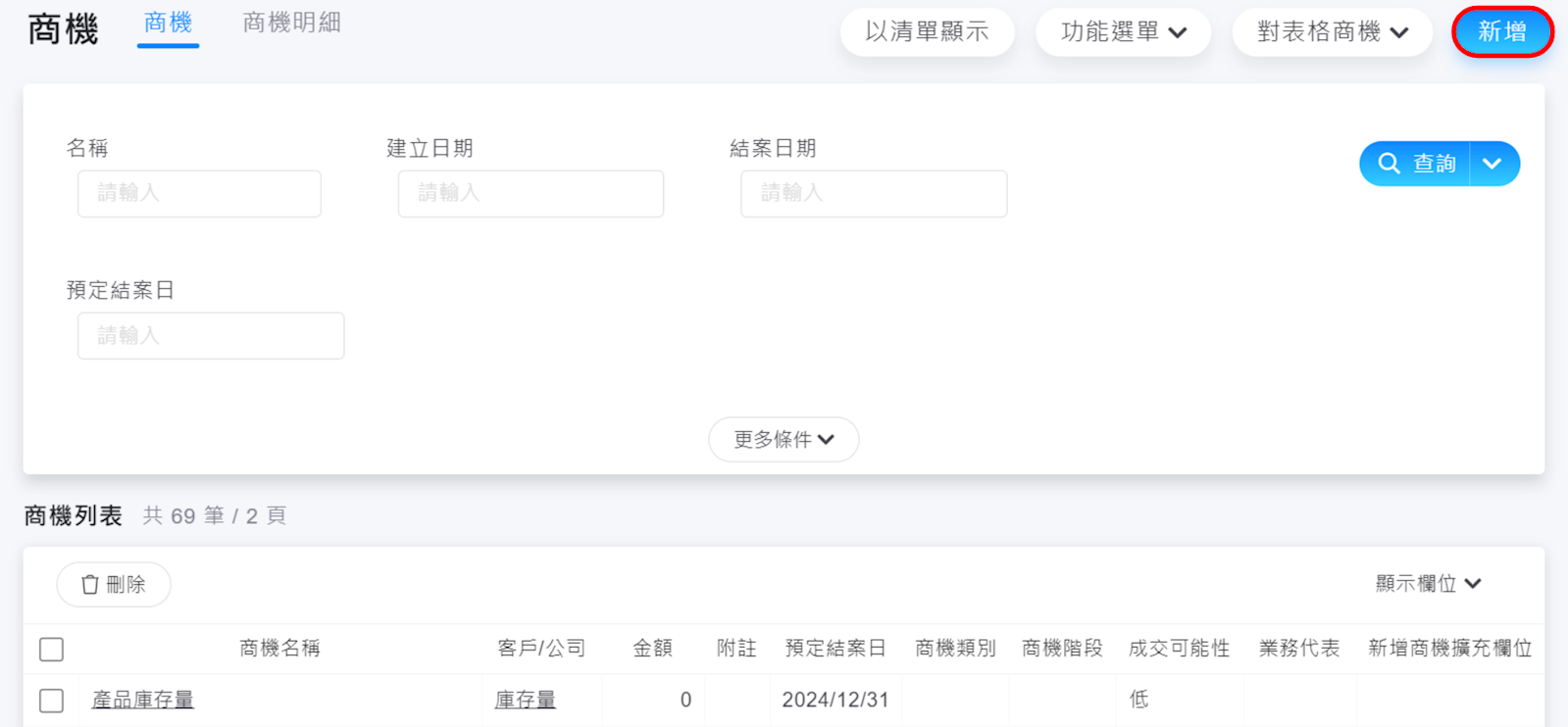 請至列表左上方【商機>新增】,開始新增商機。