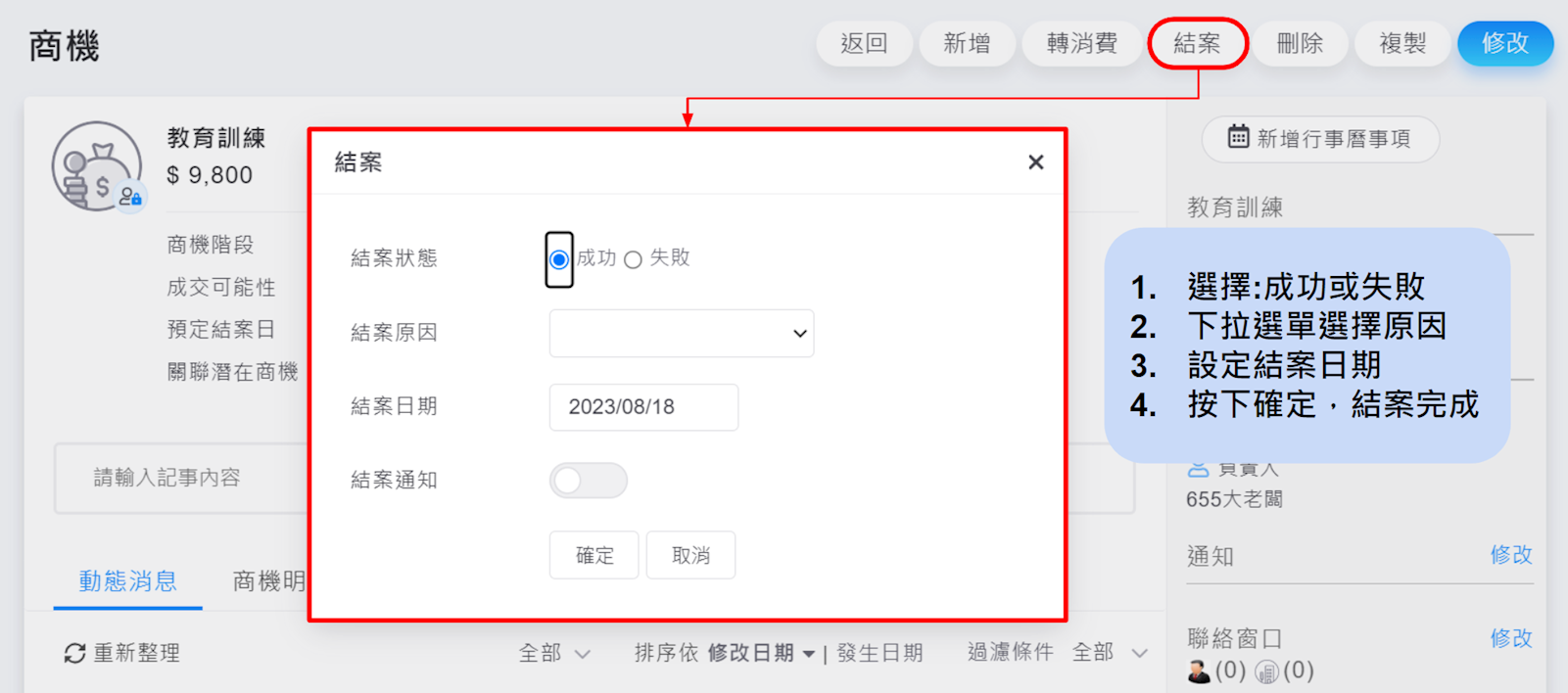 ※關於商機結案的操作,可以閱讀此篇文章,了解更詳細的內容。