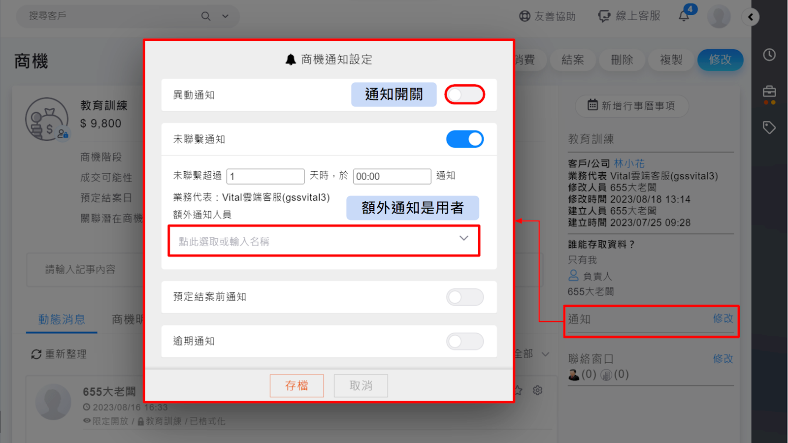 商機追蹤可透過通知功能提醒輔助,業務可根據案件的重要性調整通知設定。