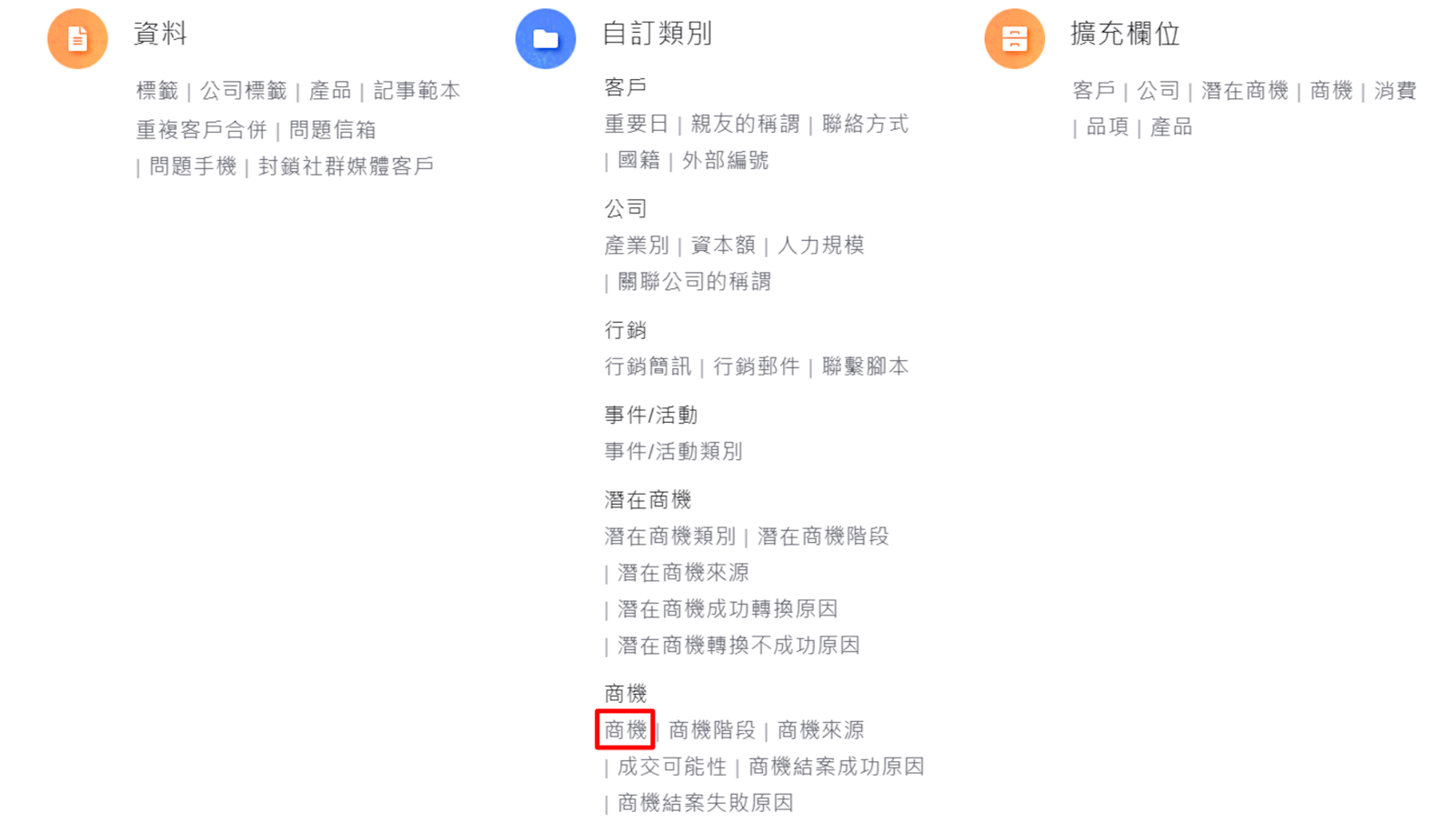 1. 請至列表左下方【管理>自訂類別>商機】。