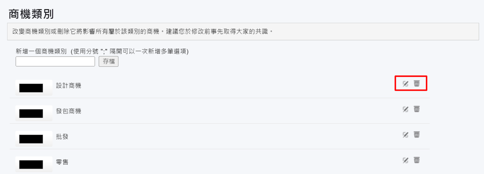 2. 可以在此新增商機類別,或是點選右方鉛筆符號或垃圾桶符號,對已建立的類別進行編輯或刪除。