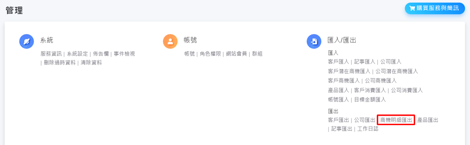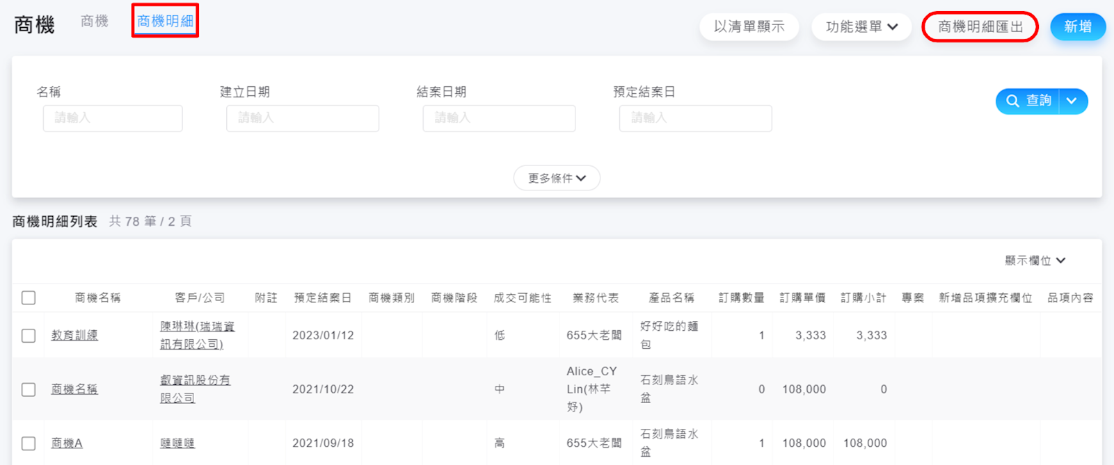 系統管理員在管理功能中使用【管理>匯入/匯出>商機明細匯出】,則會匯出系統內所有的商機明細,且包含所有可勾選的欄位。