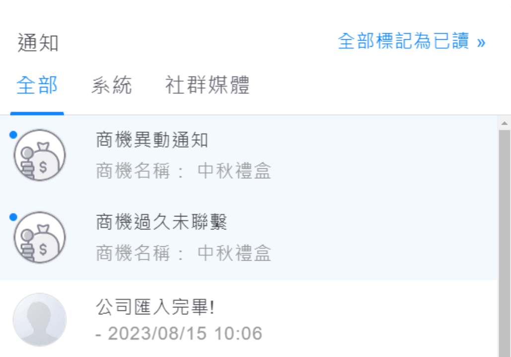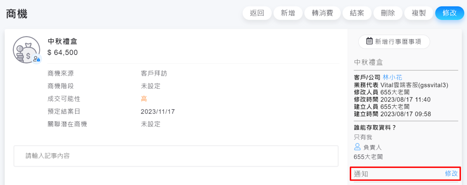 1. 於列表左上方【商機】,進入商機頁面後,點選您欲查看的商機,於商機詳細資料畫面右側,可以看到通知列表區塊。