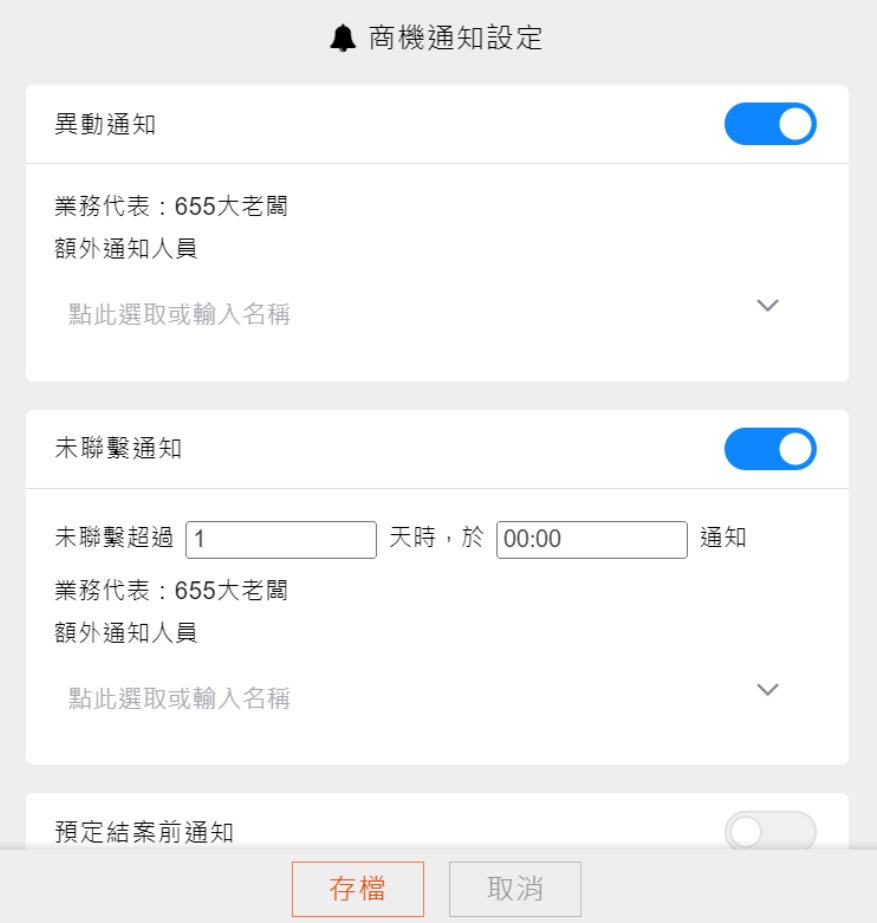 2. 點擊右側【修改】,於設定畫面可以開啟、關閉或修改各類型通知的額外通知人(所有類型的通知信,預設都是寄給業務代表,額外通知人則會以副本的收件者加入,所以未設定業務代表時,就不得設定通知,系統會發出提示訊息)。