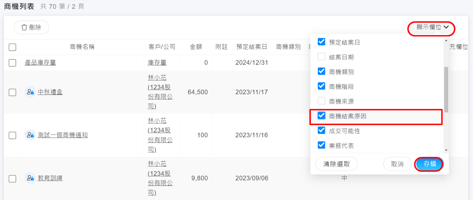 請至列表左上方【商機>商機列表】中點選【顯示欄位】,勾選【商機結案原因】,點選【存擋】後,列表將顯示商機結案原因,以便使用者在瀏覽商機列表時查看。