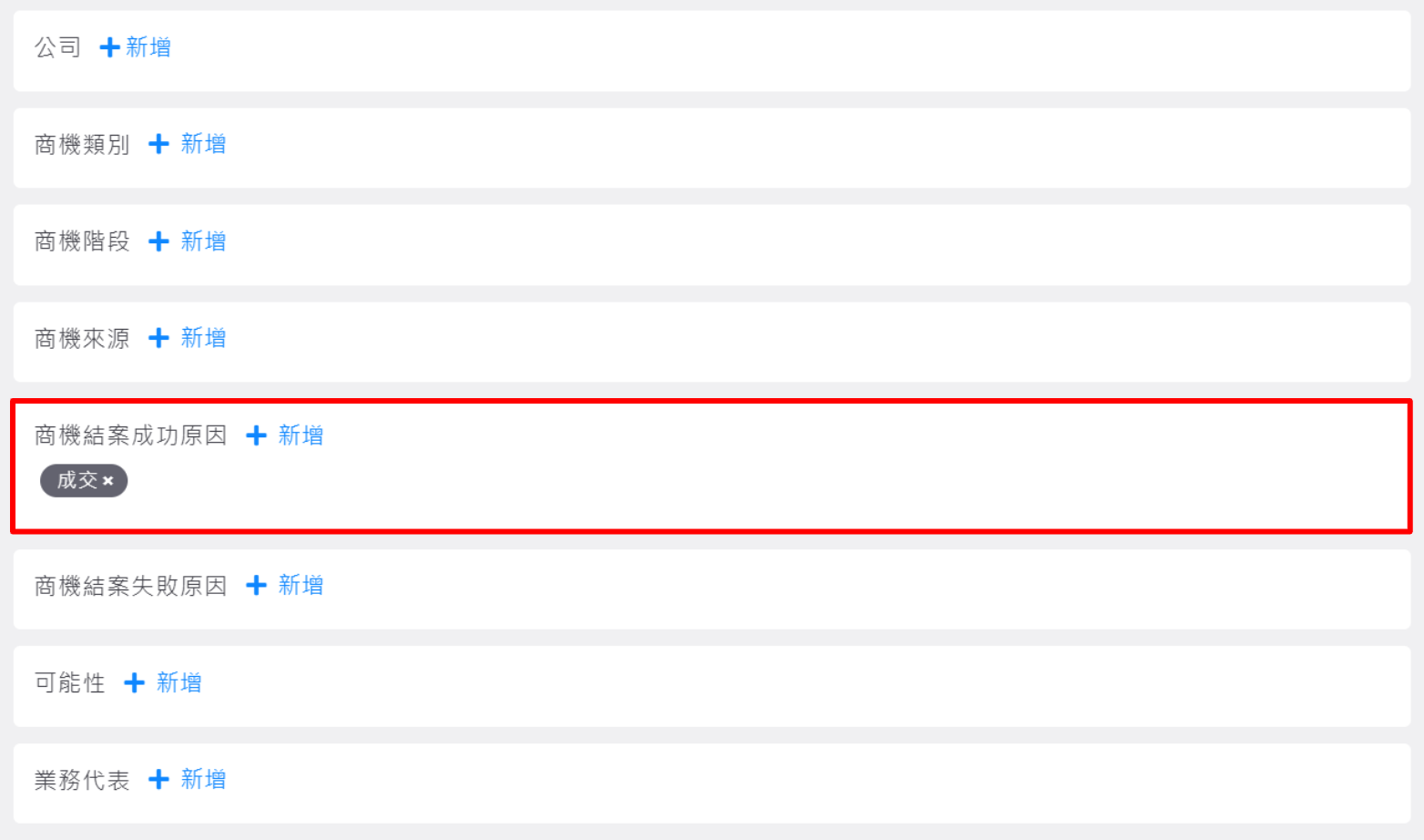 請於商機列表畫面展開進階查詢,可以使用成功與失敗原因來查詢資料(不同條件之間的關係為「且(and)」,若同時選擇成功與失敗原因作為條件,就會查不出資料)。
