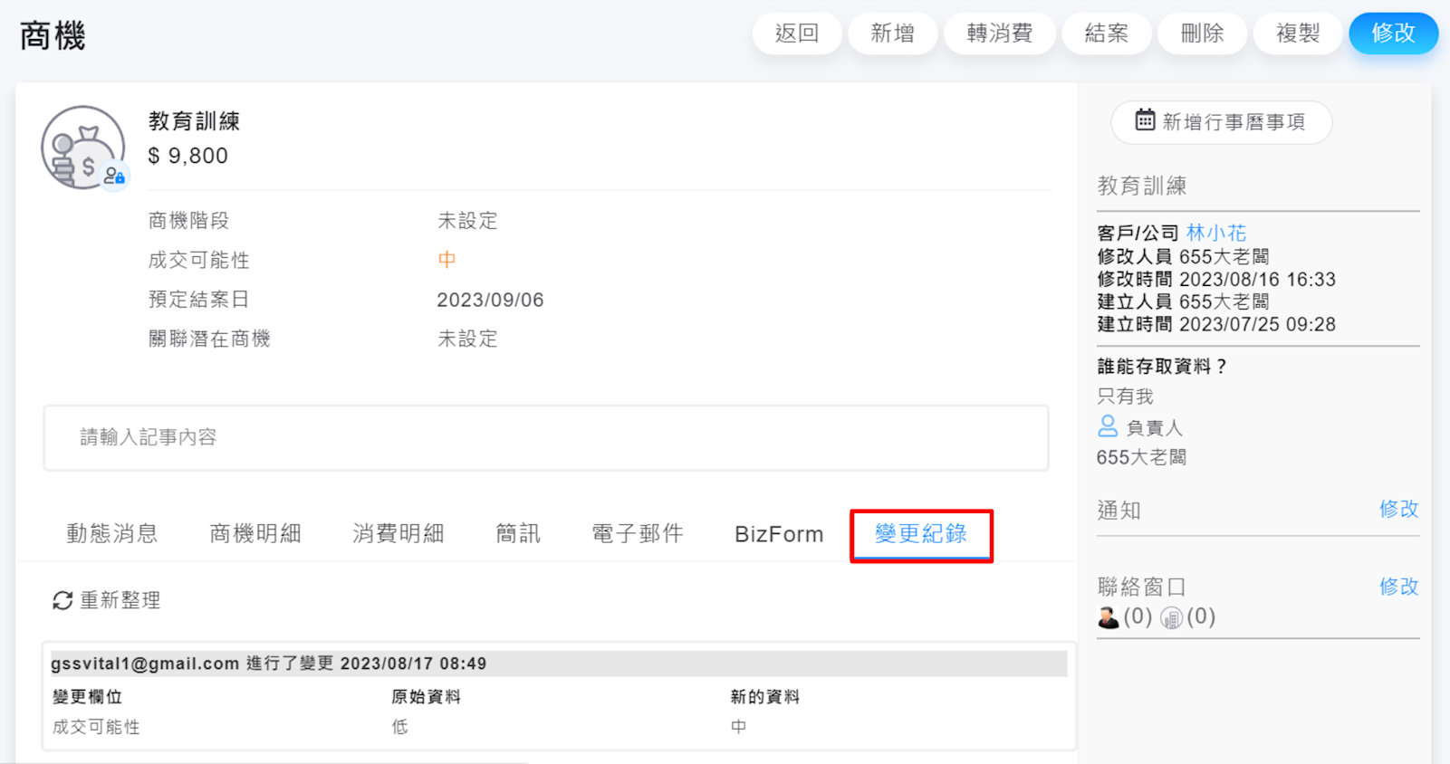 系統會保存商機的變更紀錄,且可在您的商機詳細資料畫面的【變更紀錄】頁籤內查看所有歷程,便於追蹤與回顧。