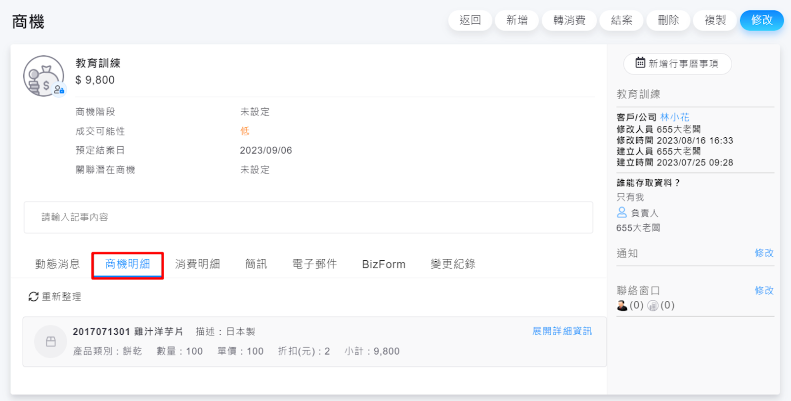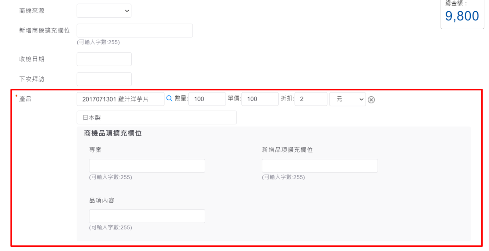 商機編輯畫面可以指定產品(即商機細項),如同消費功能的消費細項,一個商機也可以對應多組商機細項。