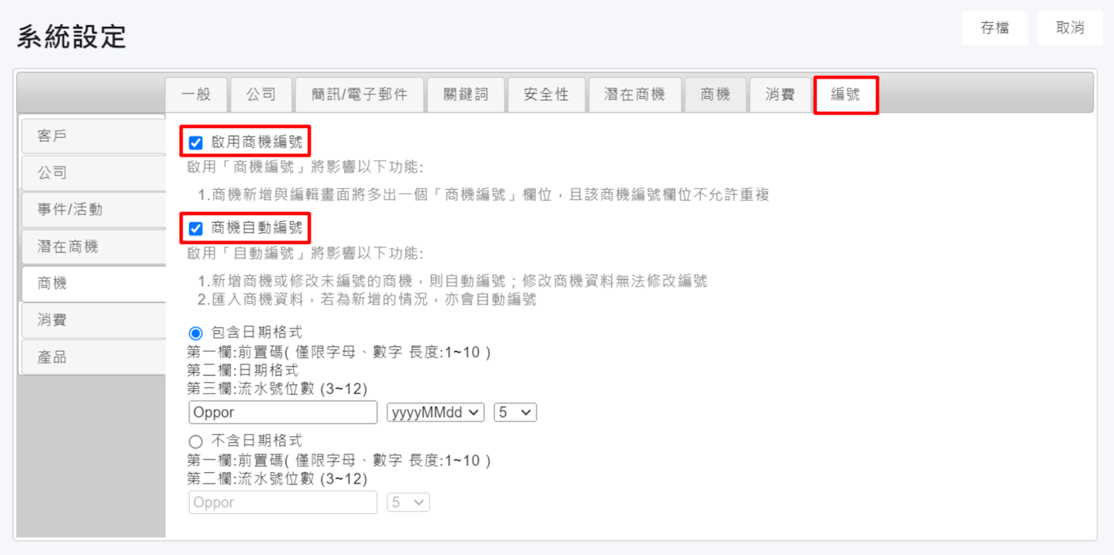 請至【管理>系統設定>編號>商機】,先勾選【啟用商機編號】,再勾選【商機自動編號】,即可開始設定編號格式。