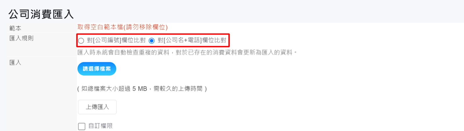 匯入規則可以選擇要以【公司編號】或【[公司名+電話]任一欄位】來找到關聯公司。如比對規則若選【[公司名+電話]任一欄位】,則此二欄為必填欄位。若選【〔公司編號〕欄位比對】,則此欄為必填欄位。