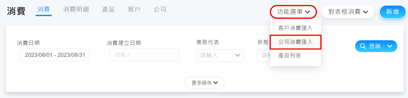 請至列表左下方【消費>功能選單>公司消費匯入】。