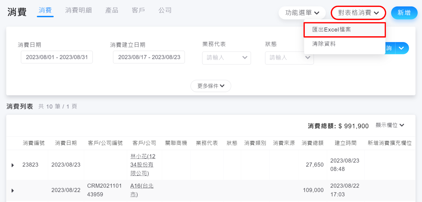您可以點選右上角【對表格消費>匯出 Excel 檔案】,將查詢出的資料匯出。