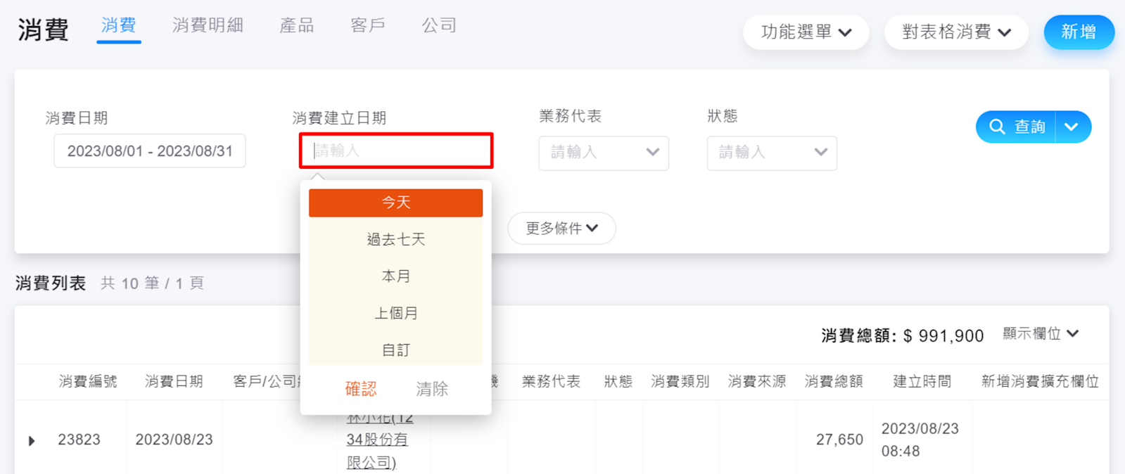 許多使用者會在某個特定的時間裡整理某段時間的訂單資料,例如每週一將前一週的消費資料匯入至系統中,由於客戶消費的時間與建立訂單的時間不一定相同,使用者可利用訂單(消費)的建立日期查詢資料。