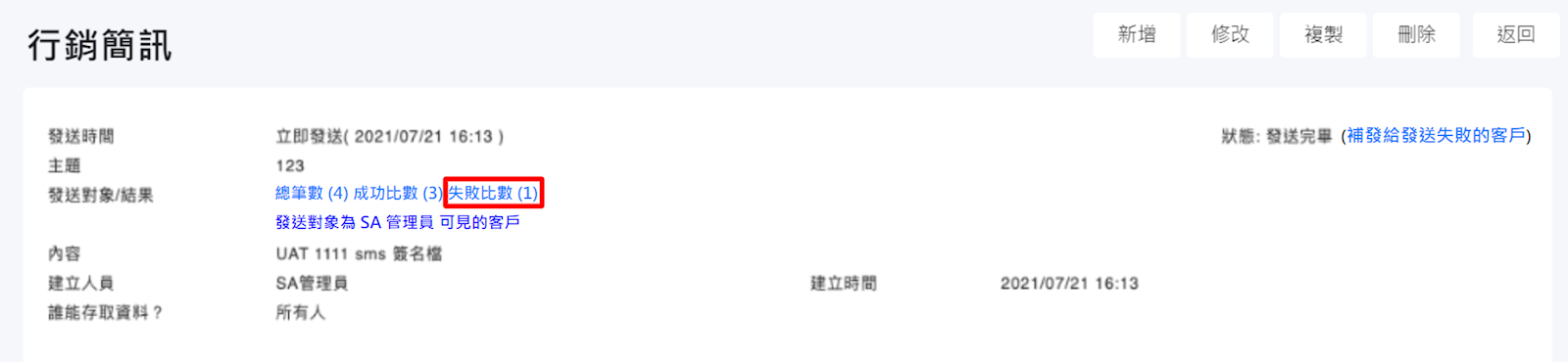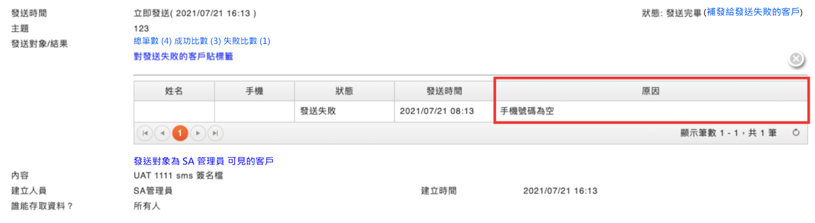 您可以在頁面中看見發送失敗的對象,以及失敗的原因。
