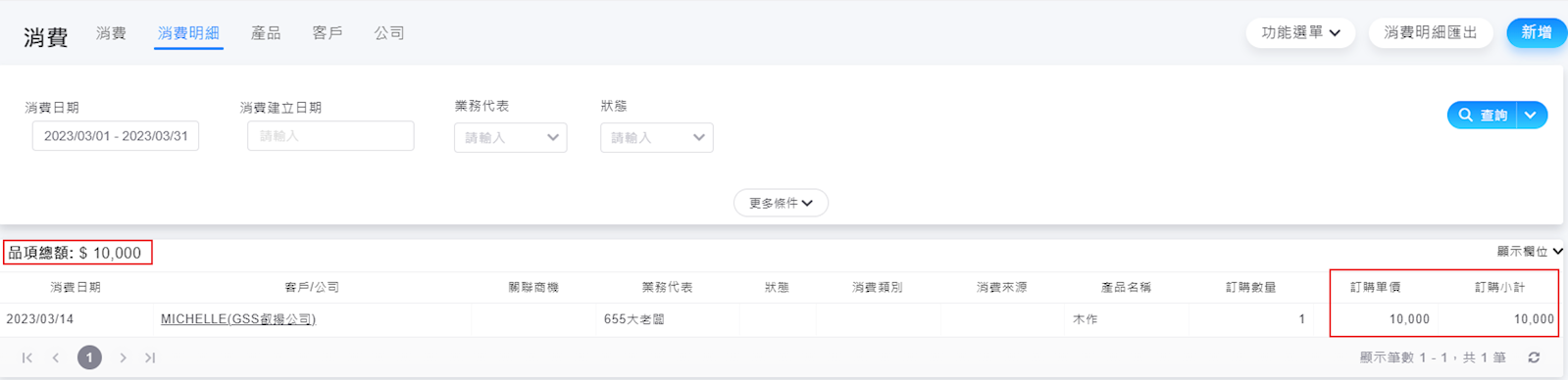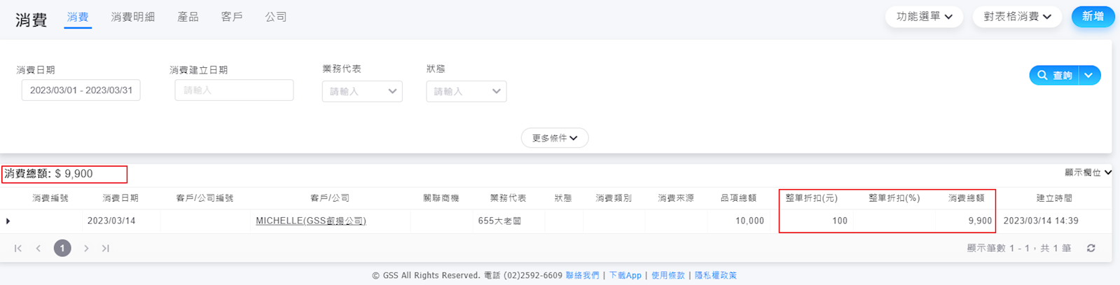 在「消費」功能查詢時,總金額會顯示被這扣後的總金額如下圖。