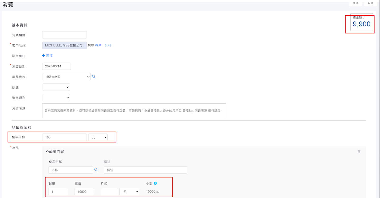如果有訂單(消費)整單折扣時,如下,一筆訂單的折扣不是針對每一個品項進行折扣,而是整筆訂單給一個折扣金額如下圖