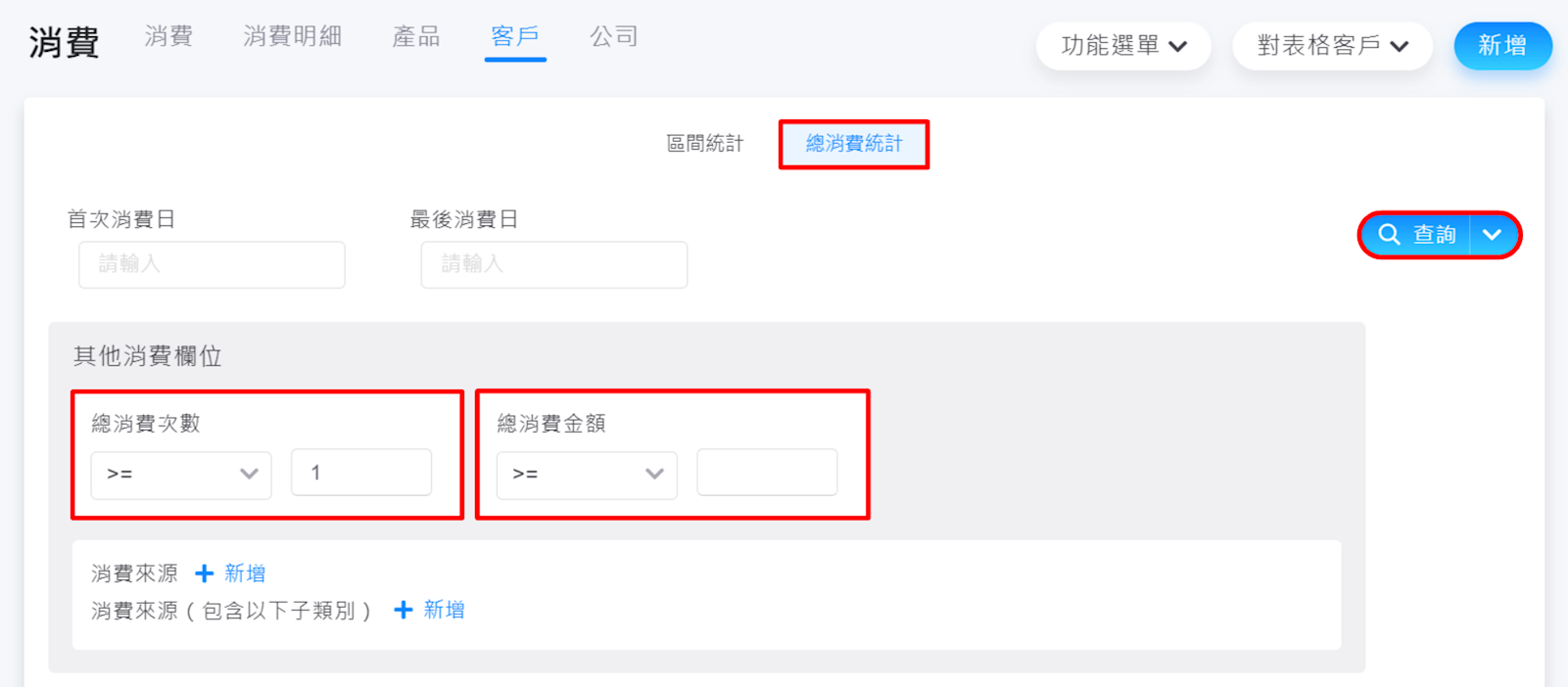 可在【消費>總消費統計>客戶、公司】的功能,在【更多條件>其他消費欄位>總消費次數、總消費金額】,並輸入【總消費次數>=0】、【總消費金額>=0】,點選右方【搜尋】之後就可以依照【客戶、公司】消費金額的少到多來查看消費紀錄。