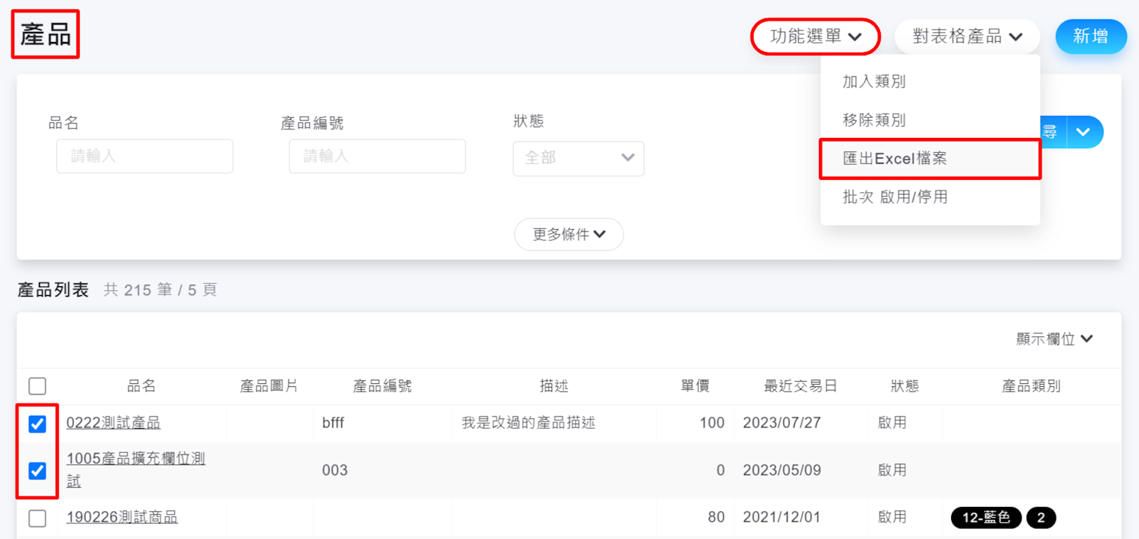 1. 請至列表左下方【管理>資料>產品】,勾選您想更改價格的產品,點選右上角【對表格產品>匯出Excel檔案】。