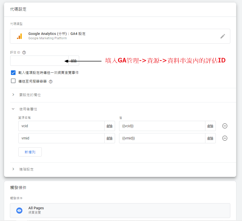 2.3 請選擇代碼類型為GA4設定,並在評估ID中填入在GA的管理->資源->資料串流中的評估ID,並在下方使用者屬性中填入vcid與vmid,觸發條件則選擇All Pages。