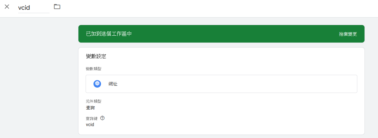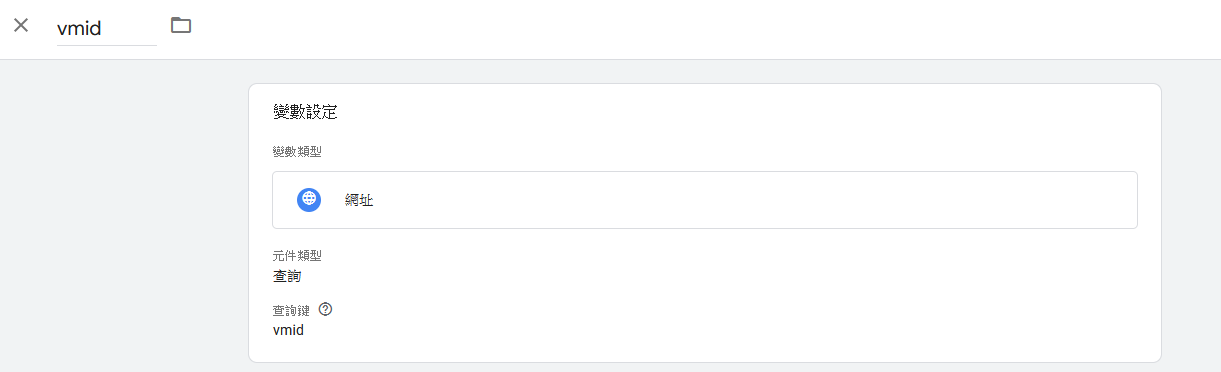 2.2 在Google Tag Manager中新增如下URL類型的變數(Variables),Component Type選“查詢”,查詢鍵分別為“vcid”和“vmid”。