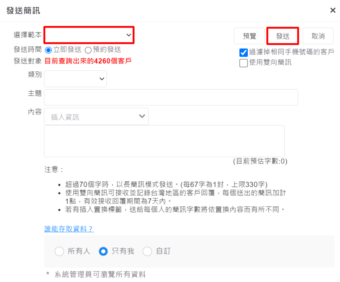 可以,請在列表左上方點選【客戶>對表格客戶>發送行銷簡訊】,即可選擇範本或編輯簡訊內容發出。提醒您,請確定您的客戶名單皆有手機號碼,否則簡訊會發送失敗。