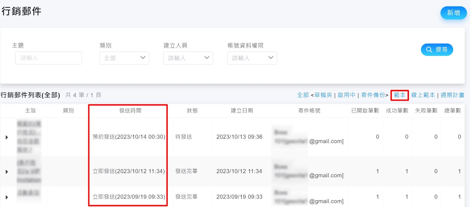 請直接進入「行銷郵件」功能,可以看見行銷郵件的發送時間,若設定完信件卻不小心存成範本,請進入列表右方的「範本」查看。