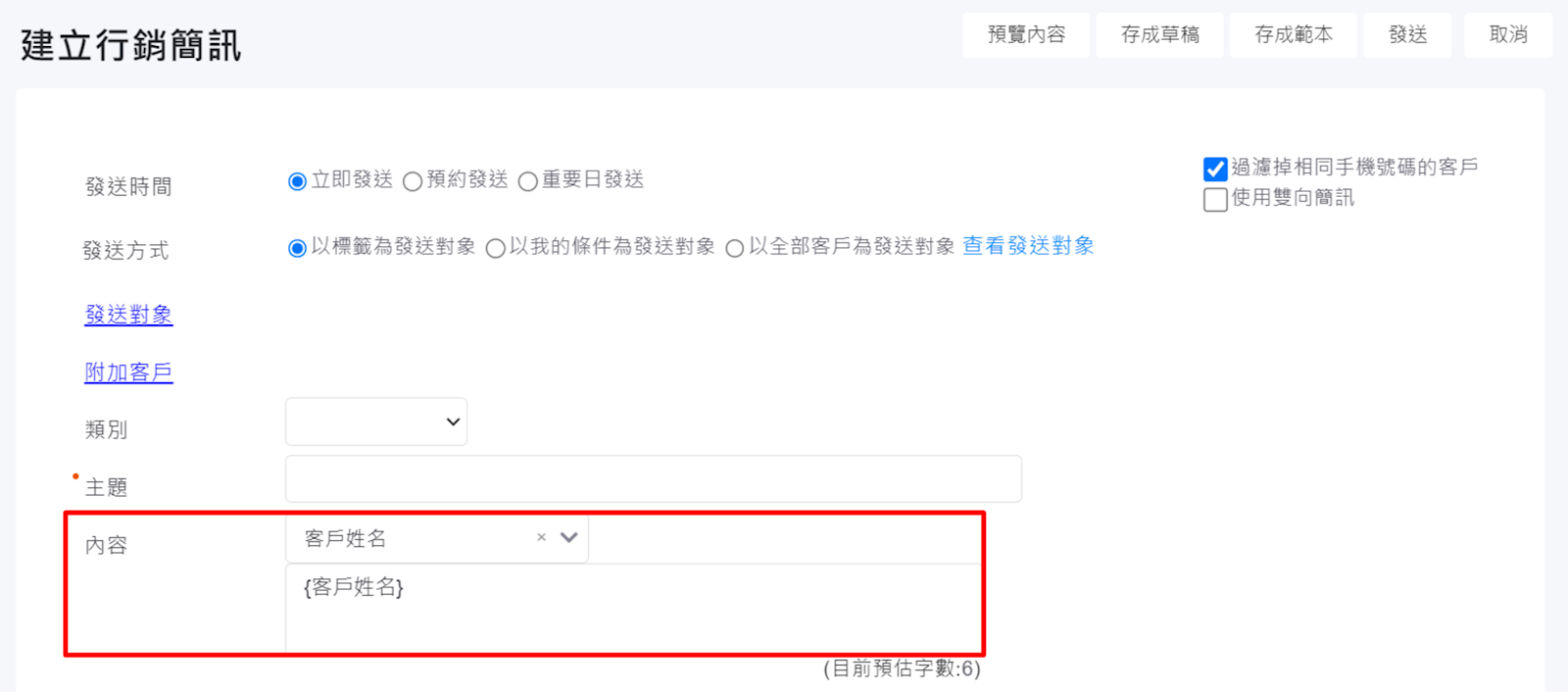 行銷簡訊也可在內容中插入資訊,您下拉選單後即可選擇客戶、公司等資訊欄位,製作個人化簡訊。提醒您,由於簡訊有字數限制,所以您在輸入內容時須注意加入資訊後的總字數。