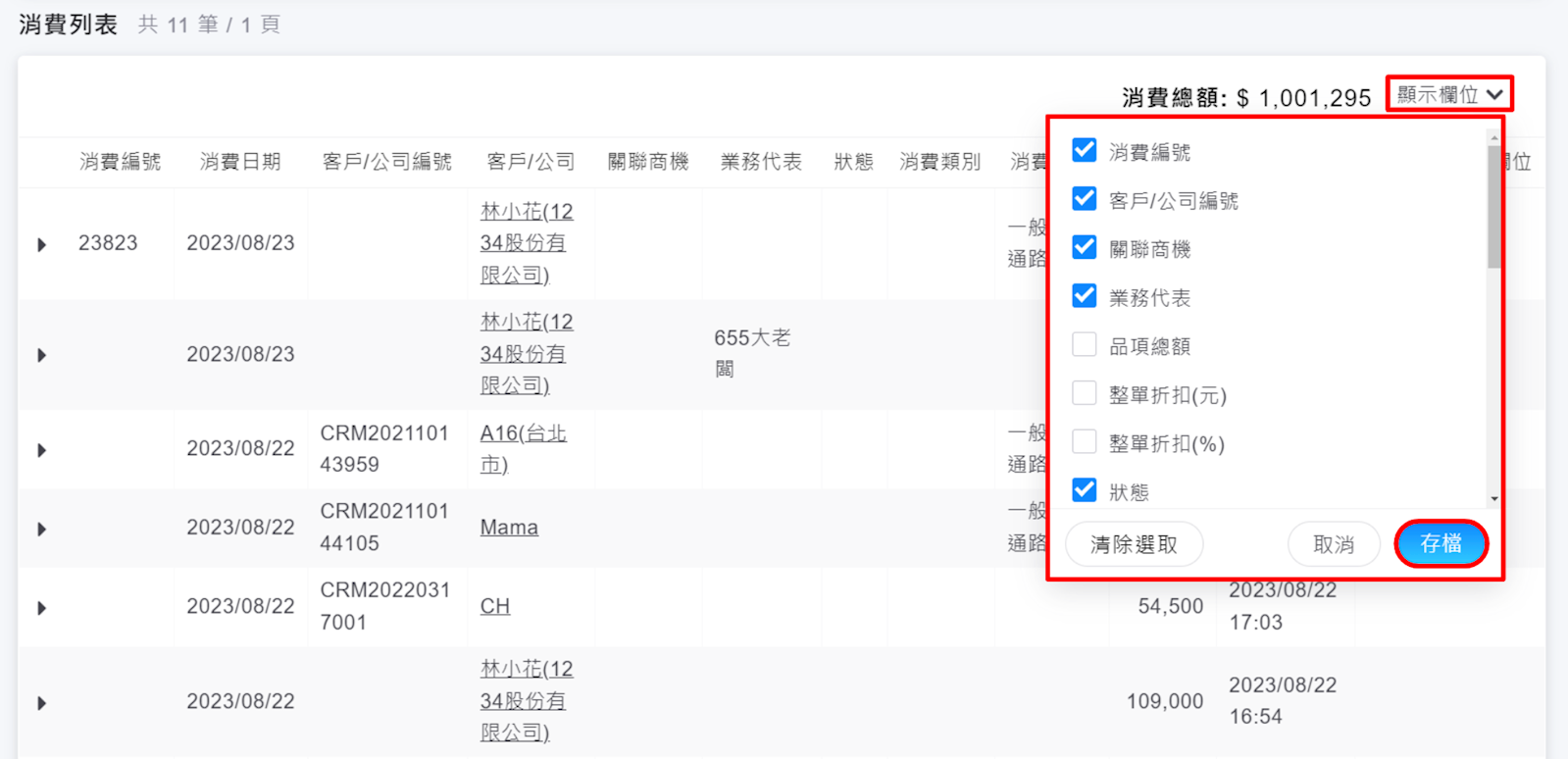 可以,請至列表左下方【消費】,消費列表畫面的各個頁籤,皆可加入了自訂顯示欄位的功能,並開放了對應資料類型的擴充欄位供選擇。
