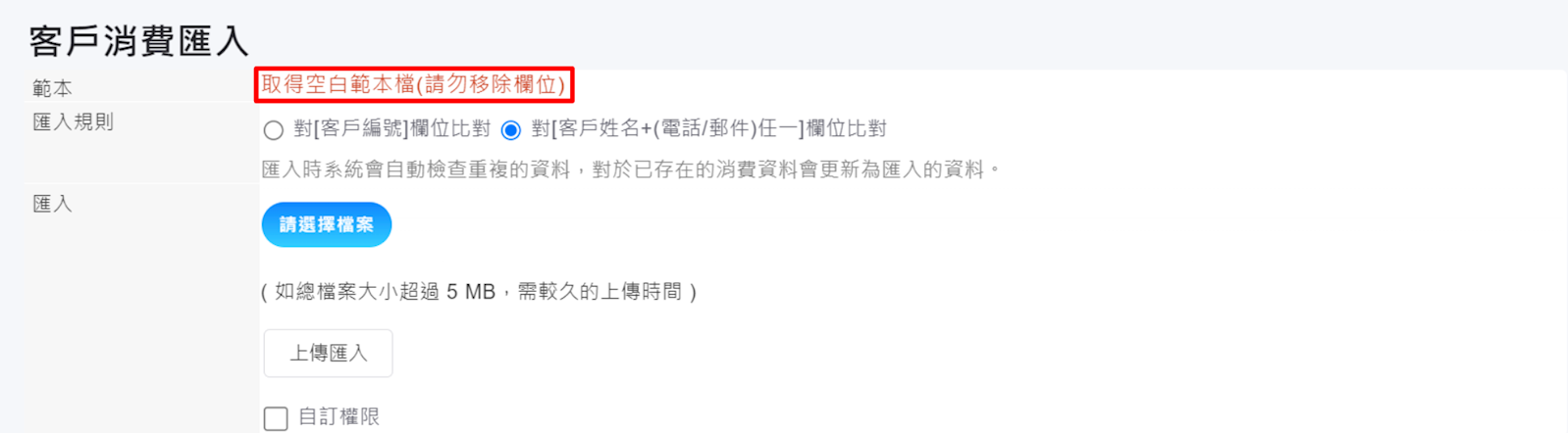 2. 接著點選【範本>取得空白範本檔】,匯入時檔案欄位要對應到系統欄位。