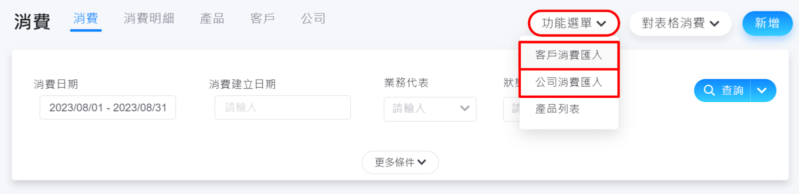 1.請至【消費>功能選單>客戶商機匯入、公司商機匯入】,並自行選擇【客戶消費匯入】或是【公司消費匯入】(如下圖)。