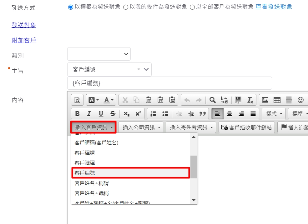 在編輯郵件內容時,也可以點擊「插入客戶資訊」,將客戶編號插入信件中。