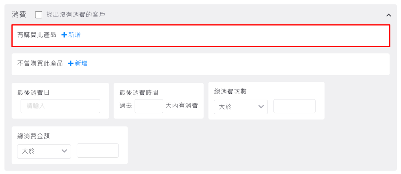 1. 請至列表左上方點選【客戶】,展開【更多條件】查詢,選擇【消費>有購買此產品>新增】,選擇產品後,搜尋即可查到購買過該產品的客戶。